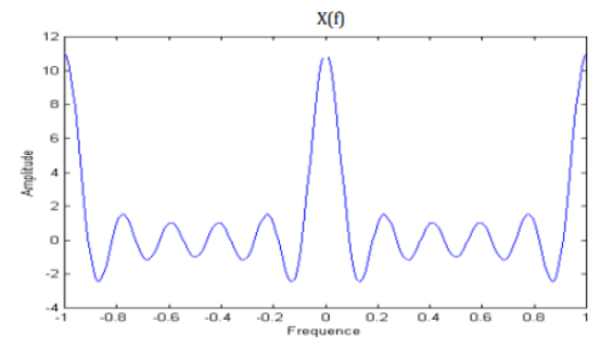 \(X\left(f\right)=e^{j\pi Nf}\frac{1-e^{-j2\pi(N+1)f}}{1-e^{-j2\pi f}}=\frac{e^{-j\pi f}\left(e^{j\pi(N+1)f}-e^{-j\pi(N+1)f}\right)}{e^{-j\pi f}\left(e^{j\pi f}-e^{-j\pi f}\right)}\ =\frac{\sin(\pi f(N+1))}{\sin(\pi f)}\) (5)