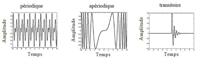 Deterministic Signals : A mathematical model can precisely describe the evolution of these signals over time. They stem from phenomena governed by known physical laws [2]. For instance, in the case of an oscillator producing a sinusoidal signal with amplitude A and frequency , we can predict the signal's value at any time using the mathematical model \(x(t)=Asin(2\pi f_0t)\) (a mathematical formula perfectly defines the signal). Within this category, we find periodic, aperiodic, and transient signals, represented in Figure 4.