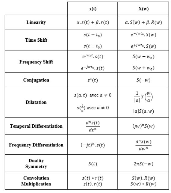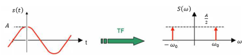 The Fourier transform of a sine function of frequency f0 and of amplitude S, and the sum of two Dirac pulses centred on the frequencies -f0 with an amplitude of S/2 and +f0 with an amplitude –S/2.